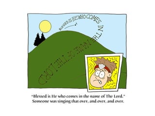 The disciples praised God as Jesus approached Jerusalem, saying "Blessed is the King who comes in the name of the Lord." Some Pharisees told Jesus to rebuke his disciples, but he said that if they remained silent, the stones would cry out instead. The document also provides biographical information about author Paul, a writer, cartoonist and video producer who has illustrated children's books and written Biblical plays, and is married with two daughters.