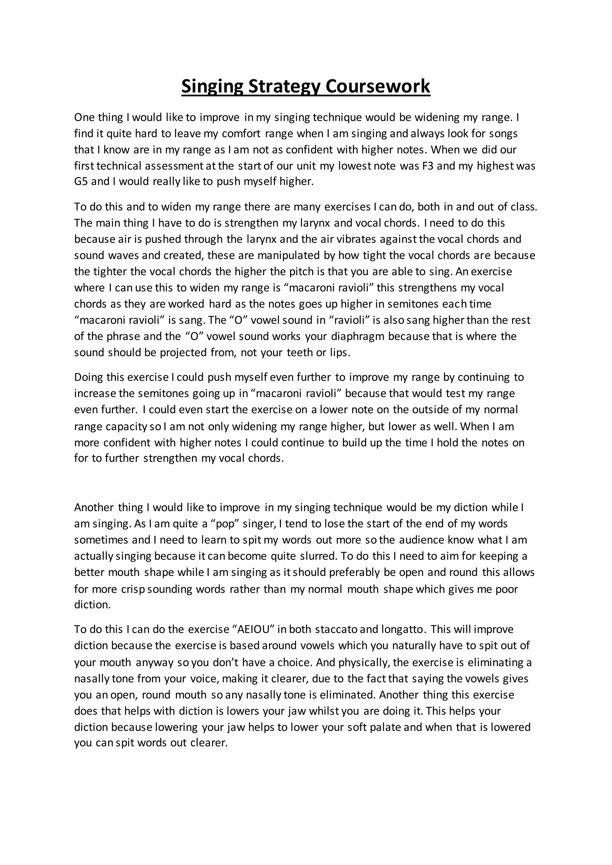 The student wants to improve their singing range and diction. For range, they intend to do exercises like "macaroni ravioli" to strengthen their vocal cords and allow them to sing higher notes. This will help widen their range from their current lowest of F3 to highest of G5. For diction, they need to maintain a round, open mouth shape to clearly enunciate words while singing and prevent slurring. Exercises like "AEIOU" in staccato and longatto will improve diction by forcing precise vowel sounds and lowering the jaw.