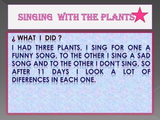 El documento describe un experimento en el que se plantaron tres girasoles y se les cantaron diferentes tipos de música. La planta a la que se le cantó música alegre creció más rápido, mientras que la que recibió canciones tristes y la que no recibió cantos no crecieron. Se concluye que las plantas necesitan amor y cuidado, resaltando la responsabilidad que tenemos hacia su desarrollo.