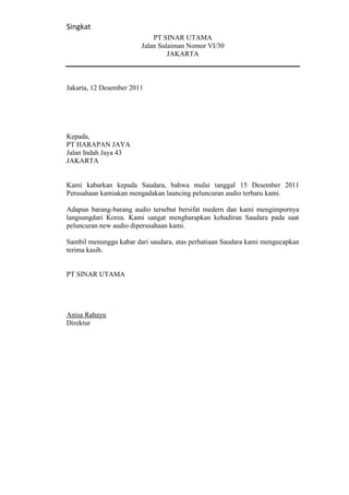 PT Sinar Utama menginformasikan bahwa mereka akan meluncurkan produk audio terbaru pada 15 Desember 2011 yang diimpor langsung dari Korea. Mereka mengundang PT Harapan Jaya untuk hadir dalam acara peluncuran tersebut. Terima kasih atas perhatian yang diberikan.