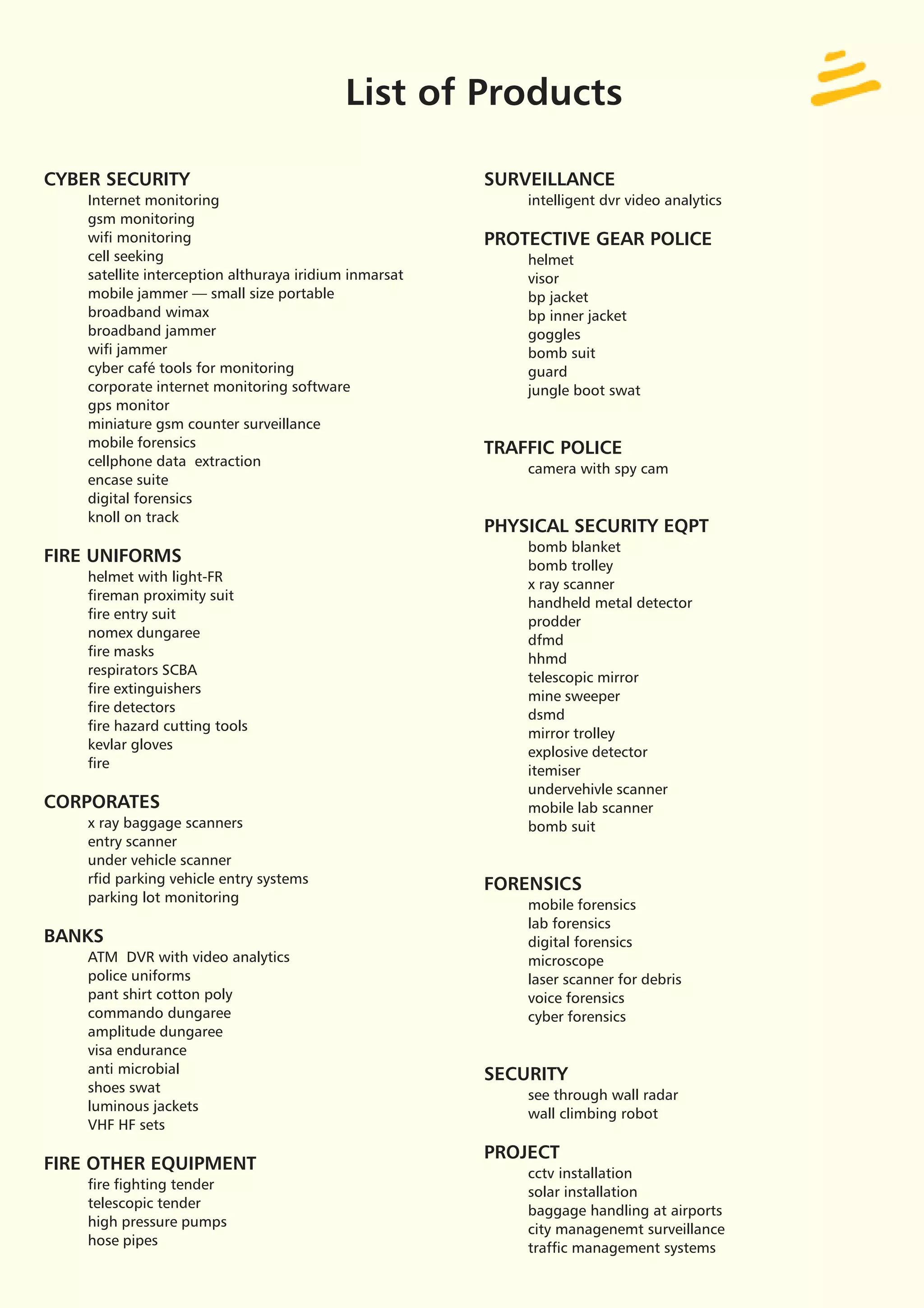 This document lists various products across multiple categories including cyber security, surveillance, protective gear for police, fire uniforms, corporate security, banks, infrastructure, electronic surveillance, security inspection equipment, police equipment, and EOD equipment. It includes over 100 specific products such as internet monitoring tools, bomb suits, x-ray scanners, handheld metal detectors, security cameras, and night vision devices. The document appears to be a catalog from a company called Totem International Ltd. that supplies security and surveillance products.