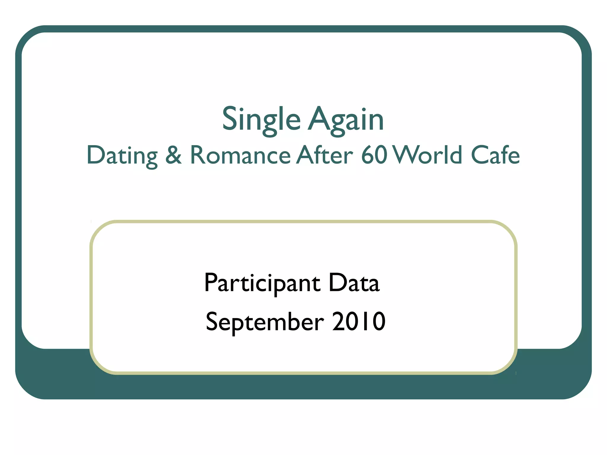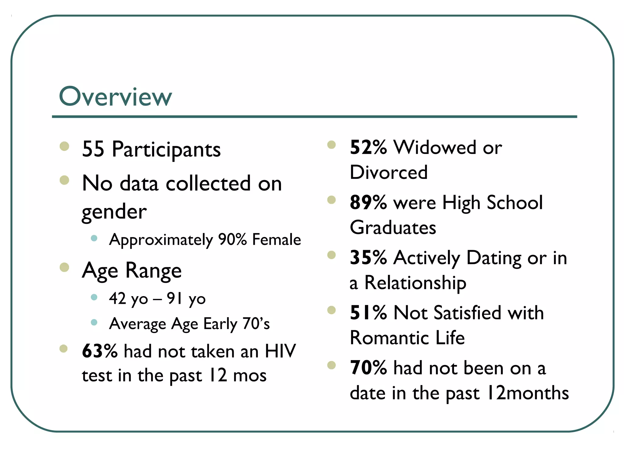 This document summarizes data from a survey of 55 older adults (average age of 70) regarding their dating and romantic lives after age 60. Key findings include: over half of respondents were widowed or divorced; about a third were actively dating or in a relationship but over half were not satisfied romantically; and over two-thirds had not been on a date in the past year. The document also examines participants' church involvement, views on safe sex practices, and how they reconcile religious beliefs with intimacy desires later in life.
