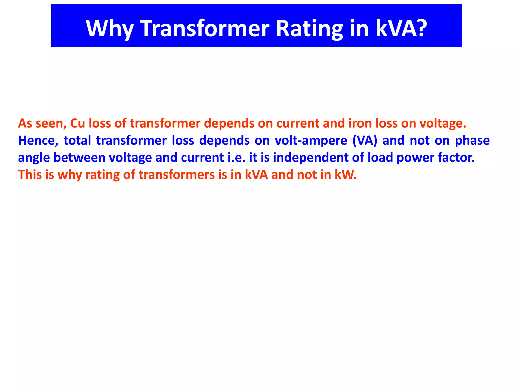 1. Transformer ratings are in kVA rather than kW because total transformer loss depends on volt-ampere (VA) and is independent of load power factor.
