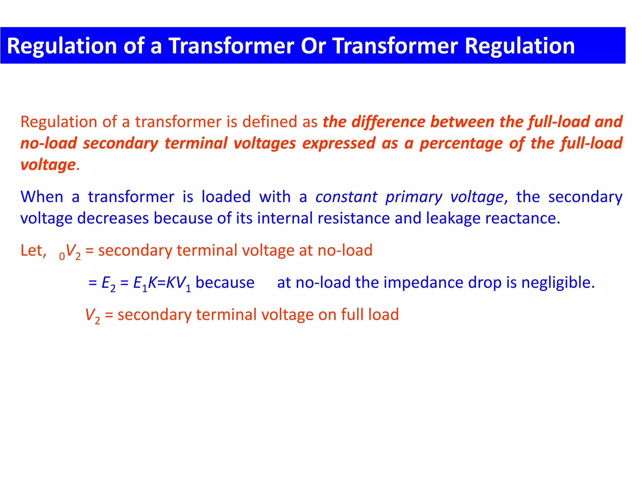 This document discusses transformer ratings, regulation, losses, and efficiency. It provides explanations for the following key points: