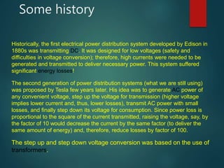 - Tesla proposed using transformers in power distribution systems to step up voltage for transmission and step down voltage for consumption, reducing power losses.