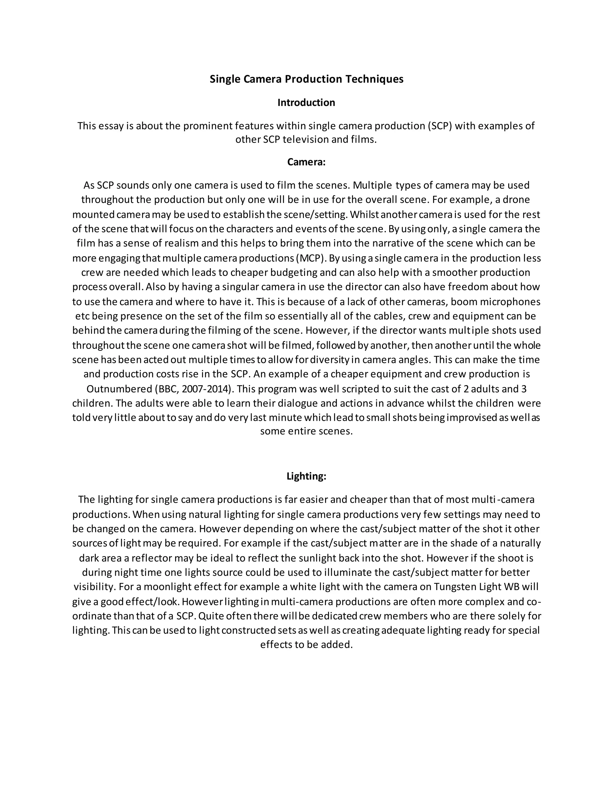 Single camera productions (SCP) use only one camera to film scenes for a sense of realism. This allows for cheaper budgets since fewer crew are needed. SCP directors have more freedom in camera placement. Scenes are filmed multiple times from different angles. Lighting and audio equipment are also simpler for SCP than multi-camera productions. TV genres like crime dramas and horror often use SCP for their realistic feel, while genres like period dramas and sitcoms may use multi-camera to capture atmosphere or allow for audience laughter. Formats include series with ongoing narratives, serials that explore many stories, and single dramas that are self-contained episodes.