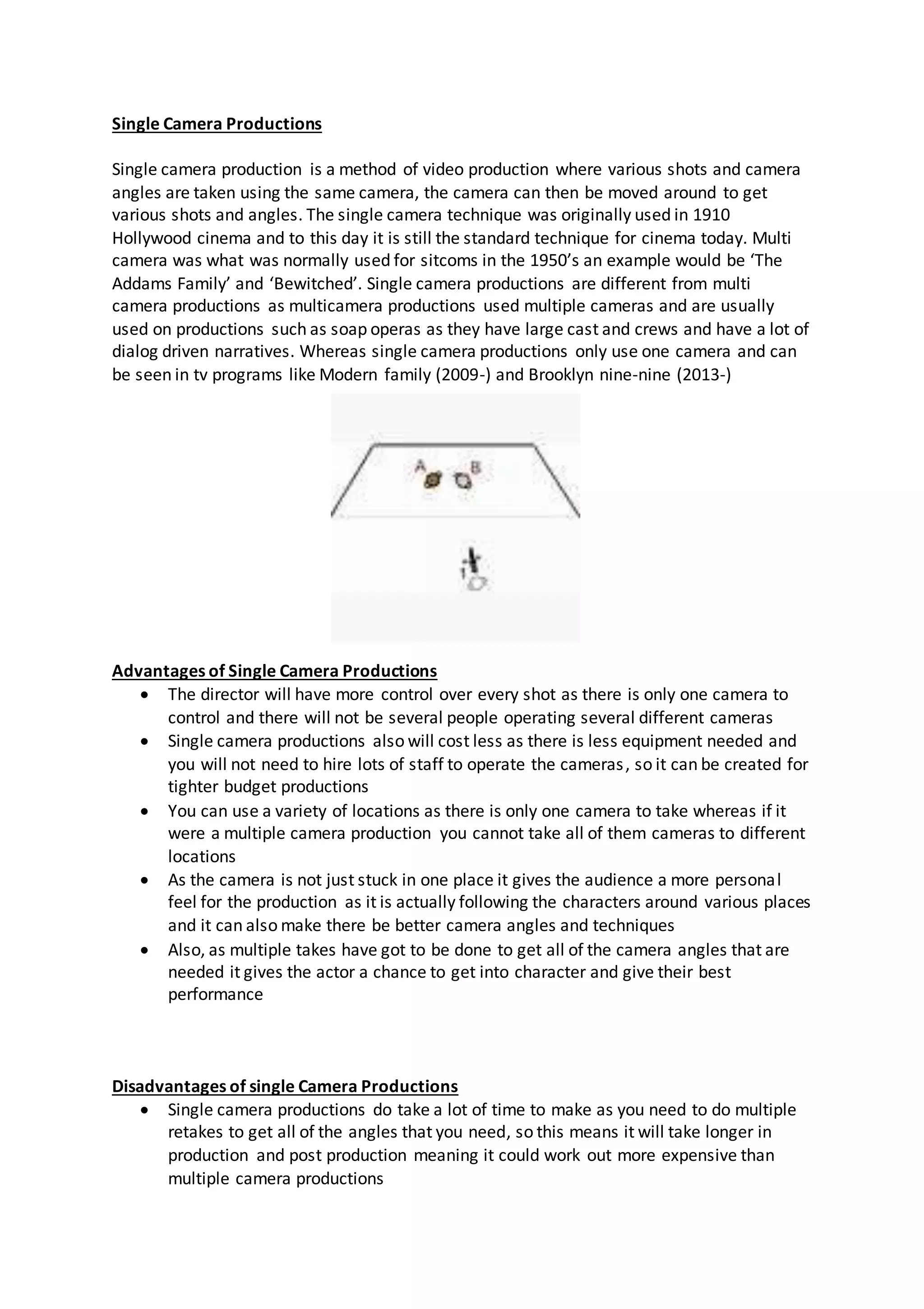 Single camera production involves using a single mobile camera to film various shots and angles of a scene. This technique was pioneered in early cinema and remains the standard for filmmaking today. In contrast, multi-camera productions use multiple fixed cameras simultaneously and are usually used for genres like sitcoms which require capturing many actors and locations. Single camera allows for more directorial control and flexibility in locations but takes more time due to needing multiple takes from different angles. It remains a popular technique for films, dramas, and music videos due to its ability to immerse viewers in a story from the perspective of characters.