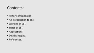 1) The history and basic components of SETs, which consist of a small conductive island coupled to source and drain leads by two tunnel junctions and a capacitively coupled gate.