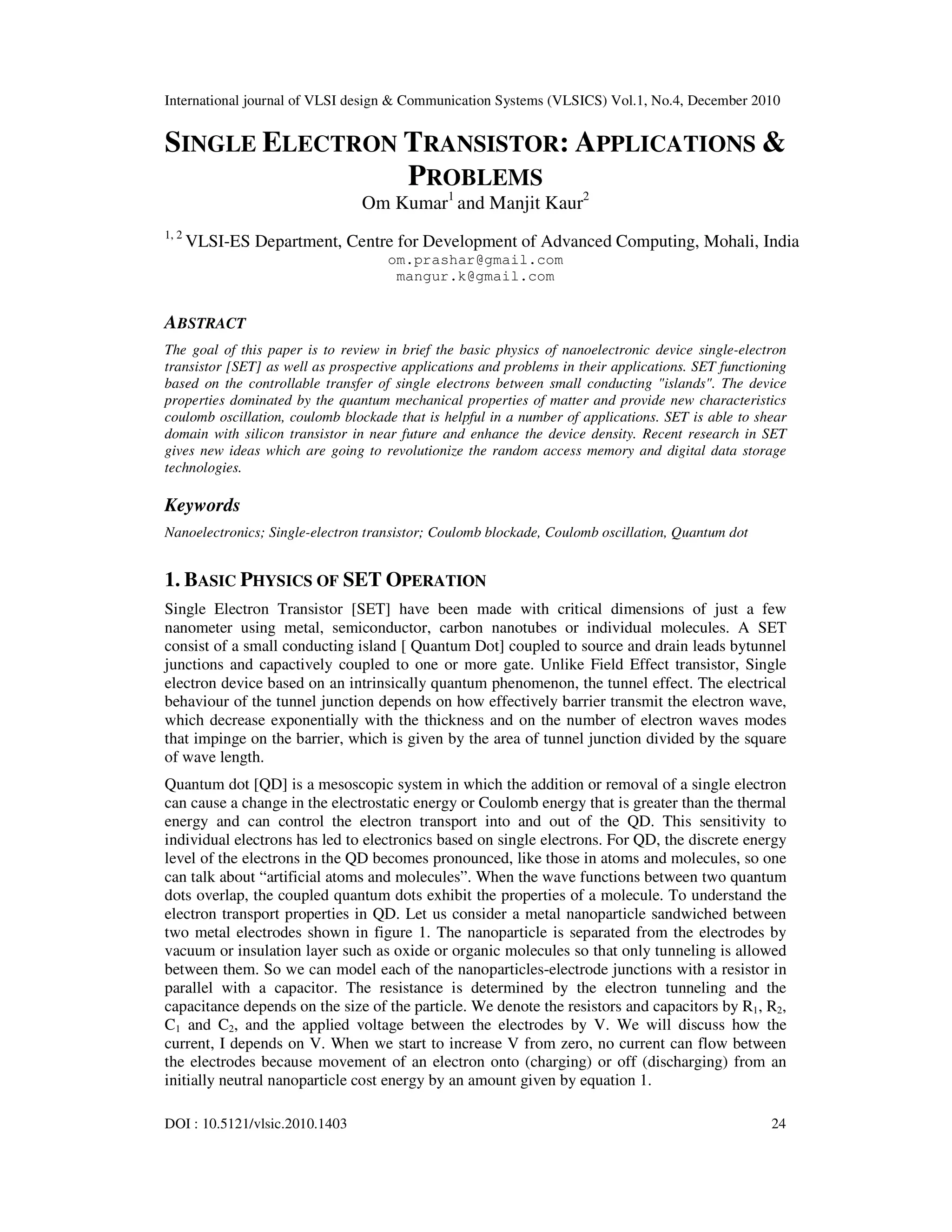 2) SETs consist of a small conducting island coupled to source and drain leads by tunnel junctions. Current flows when the applied voltage exceeds the threshold voltage needed to overcome Coulomb blockade.