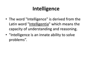 This document discusses different theories of intelligence and definitions of intelligence quotient (IQ). It provides classifications of intelligence levels from genius to idiot based on IQ scores. It also profiles Alfred Binet, who developed one of the first IQ tests to identify students needing extra help in school. Binet defined intelligence as the capacity to judge, reason, and comprehend well. The document also summarizes Binet's single factor theory of intelligence, which views intelligence as a general ability affecting all individual activities. However, this theory was later criticized by Charles Spearman who argued intelligence is a combination of general and specific factors.
