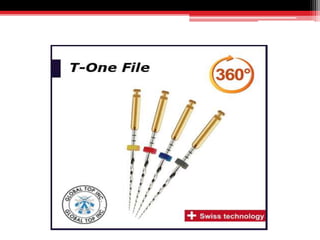 This document provides information on single file systems for root canal preparation. It discusses the history of reciprocation motion and generations of rotary file systems. Specific single file systems like WaveOne and Reciproc are described in detail, including their design features and advantages. The document emphasizes that recent advances in endodontics have focused on completing root canal shaping with only one or two files to be more efficient and minimize procedural errors.