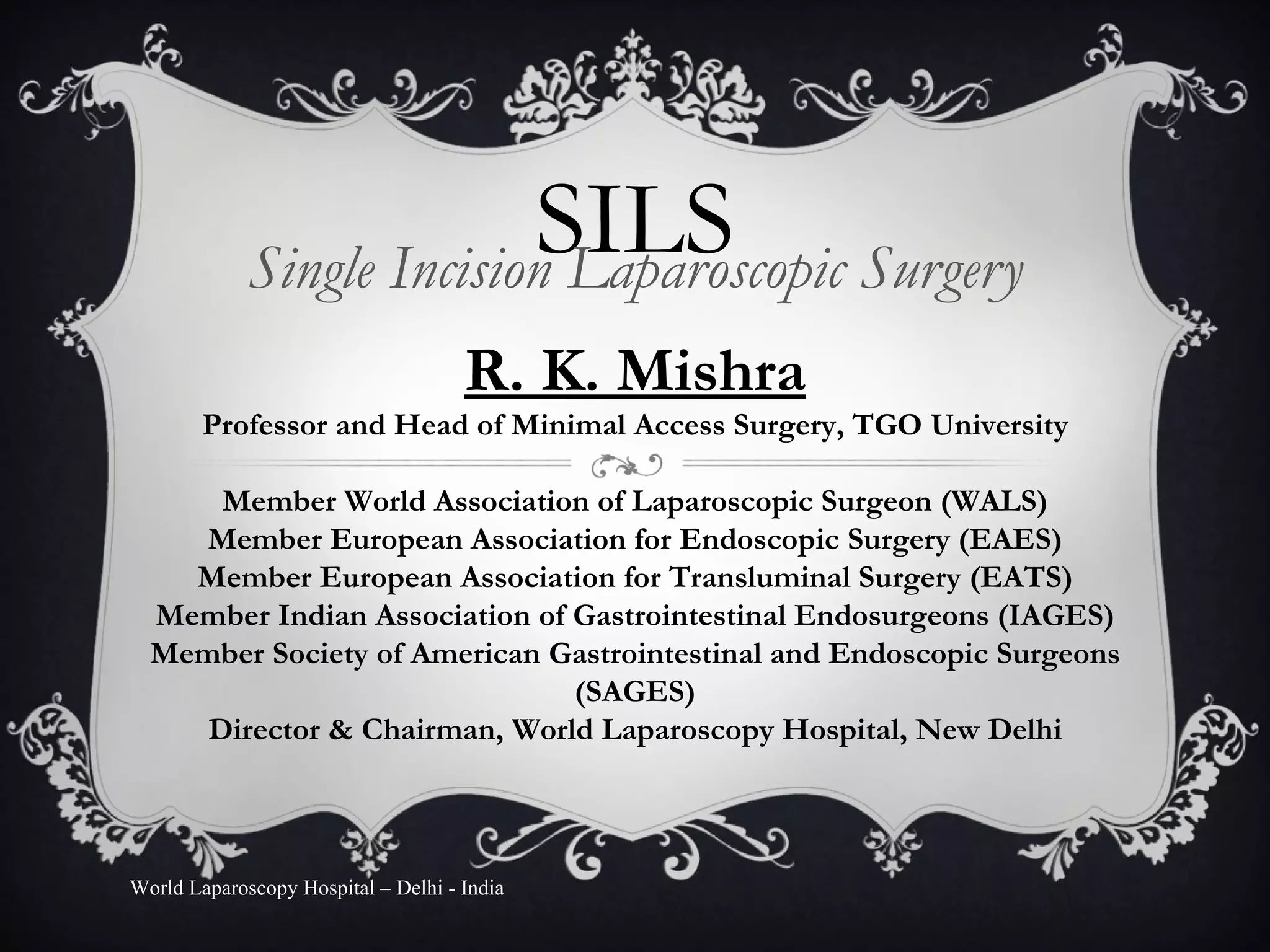 Single Incision Laparoscopic Surgery (SILS) was first performed in Turkey and later introduced in India at World Laparoscopy Hospital, Delhi. The advantages of SILS include improved cosmesis, ease of tissue retrieval, and high patient acceptance, while the disadvantages may include pain, potential hernia, and a learning curve. The document discusses the equipment, procedures, and innovations associated with SILS in the context of minimal access surgery.