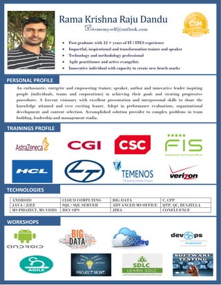 Rama Krishna Raju Dandu is an enthusiastic trainer, speaker, author and leader with over 12 years of experience in IT and ITES. He is an agile practitioner who inspires individuals and teams to achieve goals through impactful trainings on technologies like Java, Android, Cloud Computing and Big Data. As an innovative solution provider, he helps organizations with performance evaluations, leadership development and complex problem-solving.