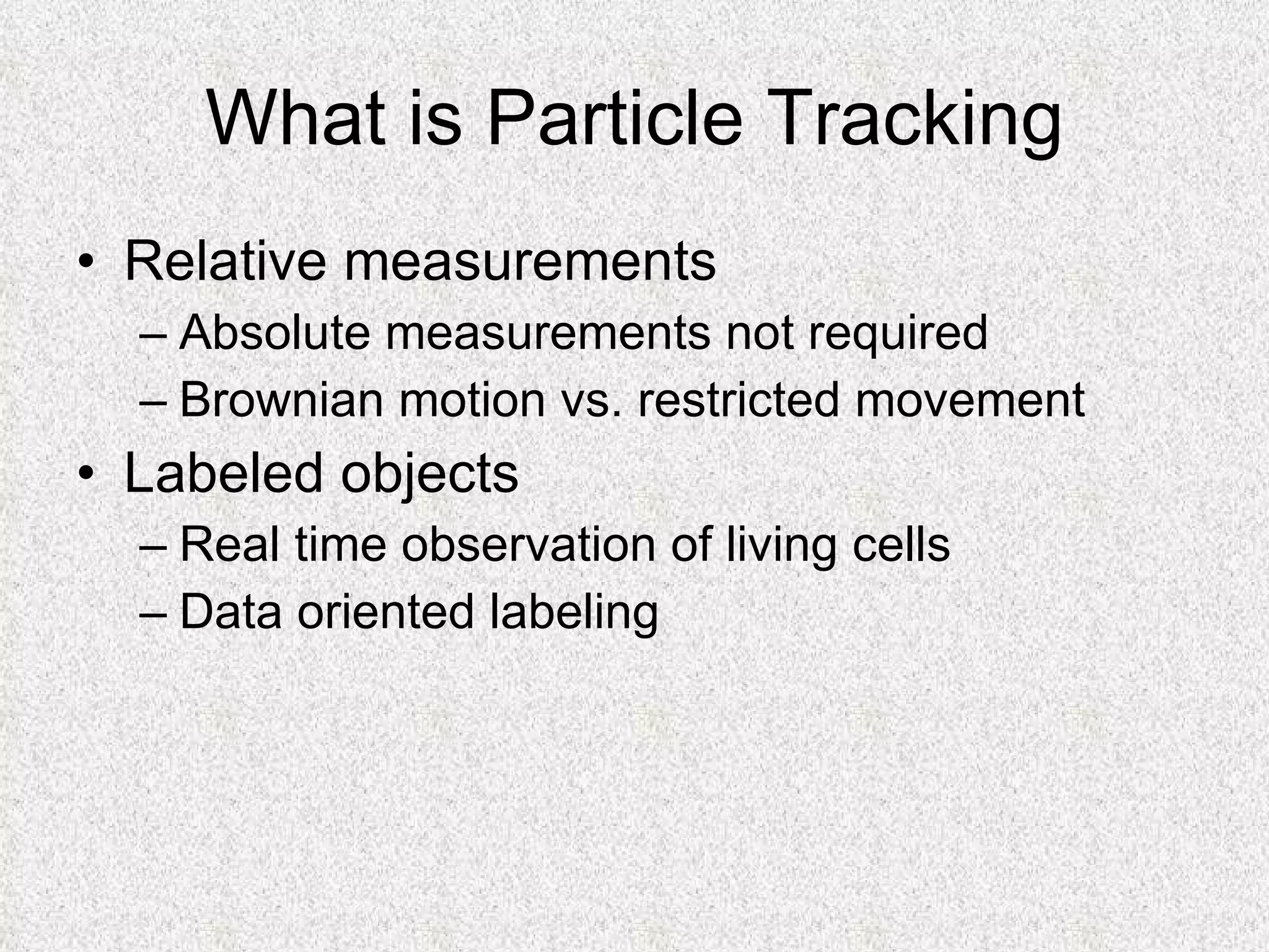 This document summarizes techniques for single particle and single molecule tracking using fluorescence microscopy. It discusses how relative measurements can be used to track labeled objects in living cells in real time without requiring absolute measurements. It also describes methods for labeling particles or molecules, considerations for sample preparation and imaging, techniques for identifying particle locations, and calculations for determining tracking precision based on measurements of photon counts and point spread functions.