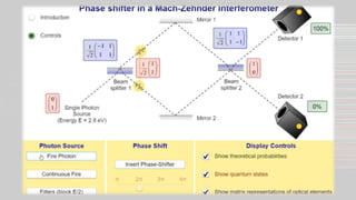 The document discusses the Mach-Zehnder interferometer, a key optical measurement device used to analyze phase shifts between light beams. It details the operation of the interferometer, including the role of half-silvered mirrors, and how it demonstrates the properties of light, particularly at the single-photon level. The application of the interferometer in quantum mechanics research and telecommunications is highlighted, along with a specific experiment focusing on photon polarization and interference patterns.