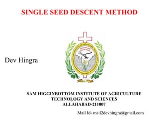 This document describes the single seed descent (SSD) method of plant breeding. It involves taking a single seed from each plant in a segregating population and bulking them to grow the next generation, allowing for rapid inbreeding. The method was proposed by Goulden in 1941 to quickly inbreed populations before evaluating individual lines. It has advantages like rapid generation advancement and requiring fewer resources than other methods. Potential disadvantages include carrying inferior material forward and losing the benefits of natural selection due to fewer field evaluations.