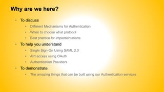 Single sign-on (SSO) allows users to access multiple systems after one authentication. Common SSO protocols discussed include SAML, OAuth, and username/password. SAML is best for single sign-on across websites while OAuth is for secure API access. Best practices include high availability, proactive certificate management, custom error pages, and testing. The document provides an overview of SSO concepts and recommendations for implementation and troubleshooting.