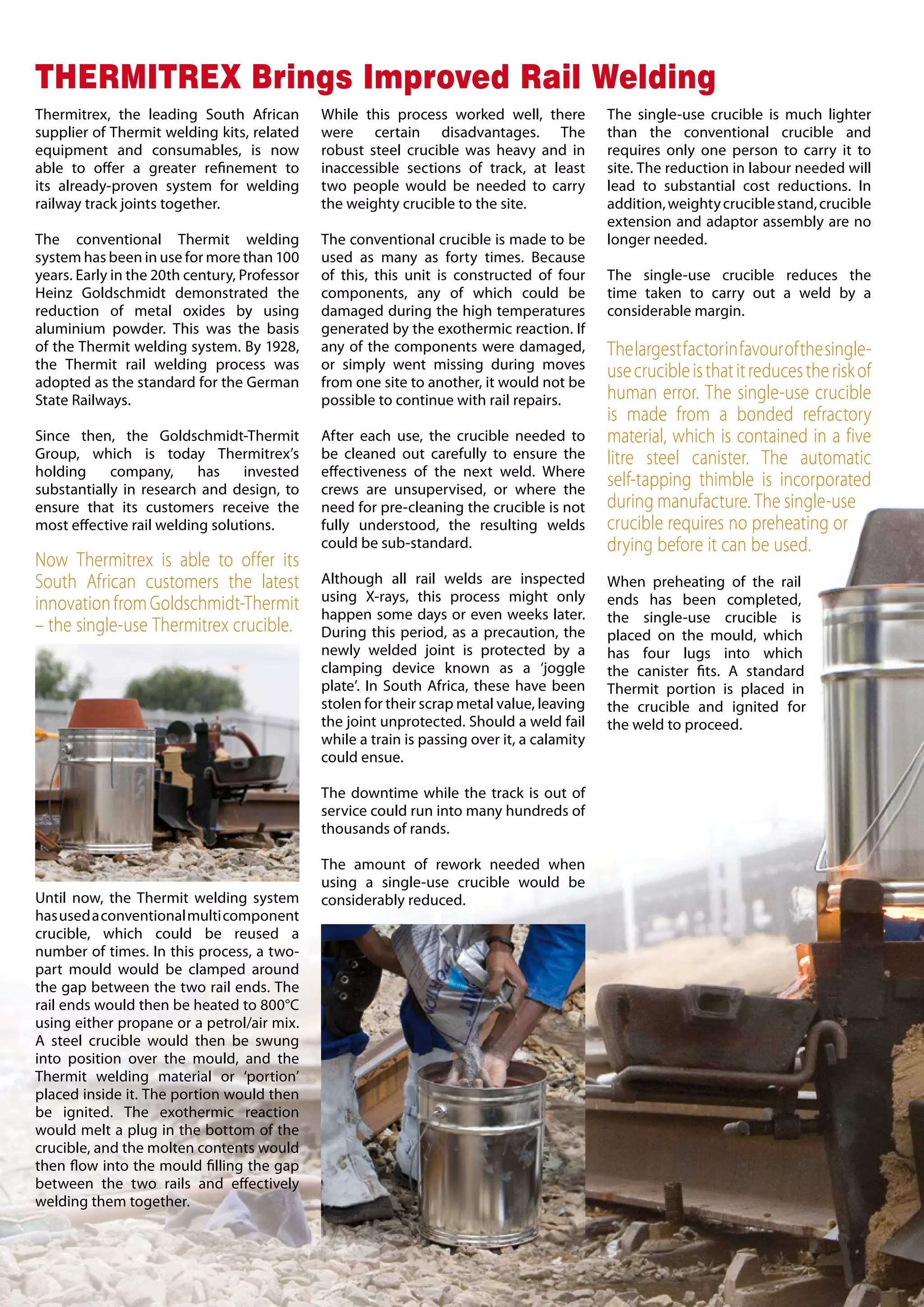 The document describes Thermitrex's new single-use crucible for rail welding. The single-use crucible is lighter than the conventional reusable crucible, reducing labor costs. It also reduces risks of human error and improves safety. The used crucible can contain all waste for recycling, improving environmental standards. Overall the single-use crucible offers numerous benefits over the conventional system at a slightly higher cost.