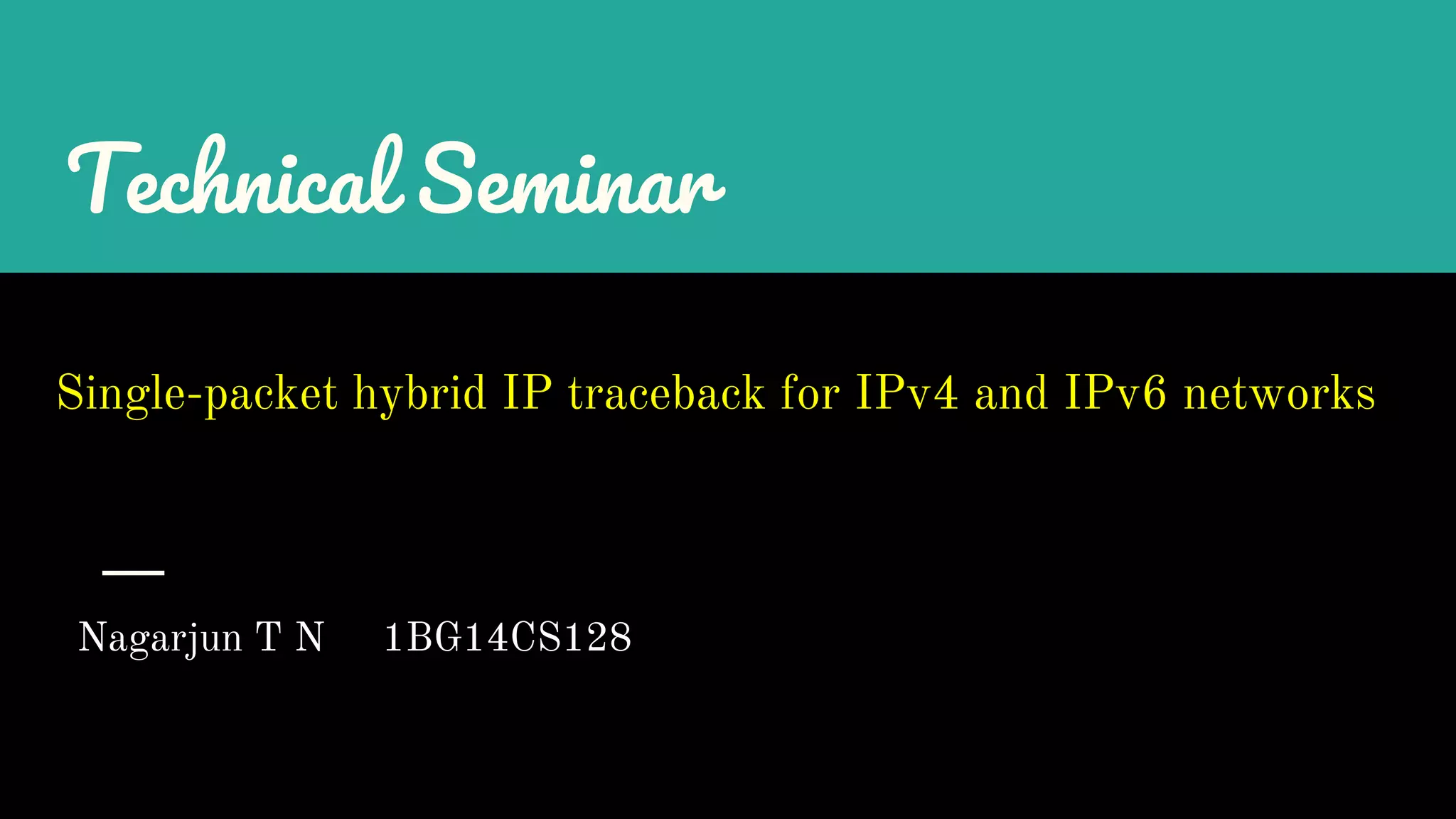 The document presents a technical seminar on a single-packet hybrid IP traceback mechanism applicable to both IPv4 and IPv6 networks, aimed at efficiently tracking the source of DDoS attacks. It reviews various literature on IP traceback methods, proposes a new algorithm for implementation, and compares its performance against existing models, concluding that the new scheme is storage-efficient and significantly reduces logging time. The findings emphasize the importance of recording path information rather than individual packet details to enhance cybersecurity measures.