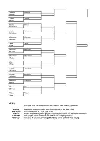 This document appears to be a draw sheet for the 2014 singles knockout competition at Belvoir Park Golf Club. It lists the pairings for each round of the competition to be played between April and August 2014. Notes at the bottom welcome new members to their first knockout series and provide instructions regarding marking results, match play rules, arranging matches, and using official golf handicaps.