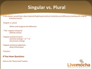 The document provides instructions for students on how to participate in a group tutoring session in Spanish over VoIP. It explains how to set up audio devices and select the correct audio options to be able to hear the tutor and speak with them. It then outlines the topics that will be covered in the tutoring session, including differences between singular and plural forms in Spanish and English.