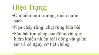 Báo cáo đề cập đến thực trạng đa dạng sinh học tại Việt Nam, nhấn mạnh tình trạng ô nhiễm môi trường, cháy rừng và nạn săn bắt trái phép dẫn đến sự tuyệt chủng của nhiều loài động vật, trong đó có tê giác java. Tài liệu đề xuất các biện pháp bảo tồn như trồng rừng, bảo vệ động vật quý hiếm và tuyên truyền giáo dục cộng đồng. Tê giác java đã chính thức tuyệt chủng tại Việt Nam vào năm 2011 và chỉ còn một số ít trên thế giới.