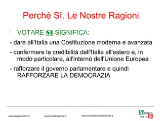 Il documento presenta le motivazioni a sostegno del referendum confermativo per la riforma costituzionale del 2016, che punta a modernizzare la Costituzione italiana, semplificare l'iter legislativo e ridurre i costi delle istituzioni. La riforma prevede l'abolizione del bicameralismo perfetto, con un nuovo senato composto da rappresentanti regionali e una semplificazione delle procedure legislative. Viene sottolineato che la riforma garantirà maggiore stabilità e rappresentanza, senza compromettere i principi democratici.