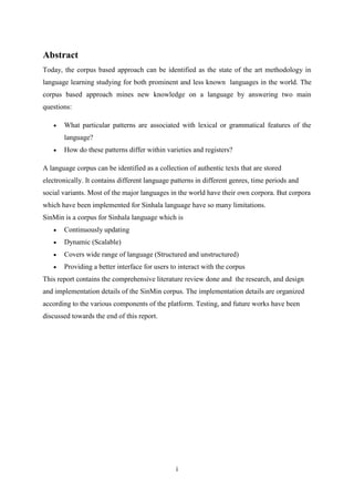 The document outlines the SinMin project, which aims to develop a dynamic and continuously updating corpus for the Sinhala language, addressing the limitations of existing Sinhala corpora. It includes details of the literature review, design, implementation, and testing of the corpus, which utilizes a range of digital data sources and offers a user-friendly interface and API for interaction. The project acknowledges the contributions of team members and supervisors in guiding and supporting the initiative.