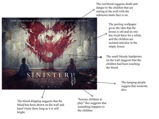 The document describes a scene where children are staring at a wall with a man's face on it covered in red blood. Small bloody handprints on the wall suggest the children touched the blood. Peeling wallpaper gives the impression the house is old and abandoned. Phrases like "beware children at play" and images of hanging people indicate something dangerous happens to the children.