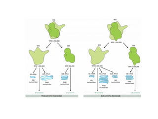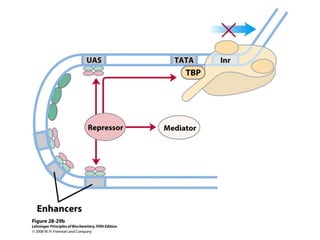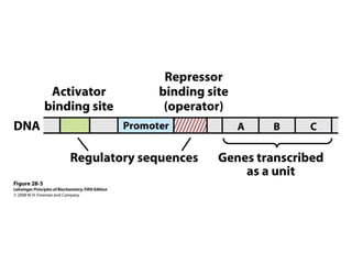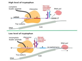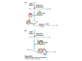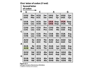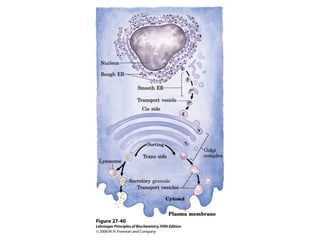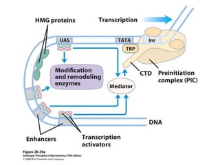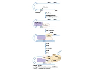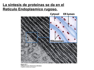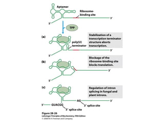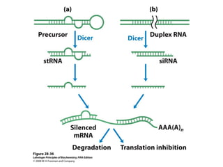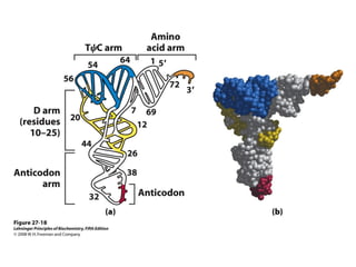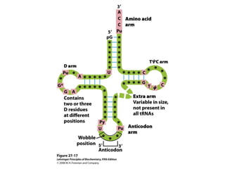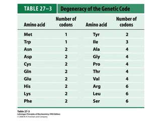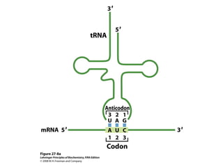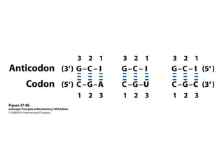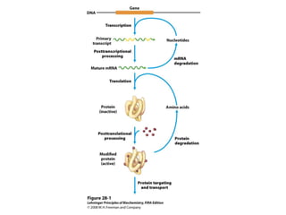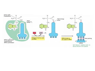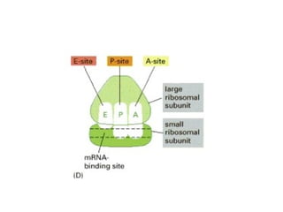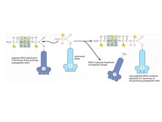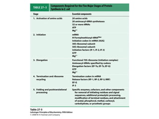 The document discusses protein synthesis and degradation. Protein synthesis occurs in the rough endoplasmic reticulum through translation - the process of mRNA being converted to protein with the help of tRNA and ribosomes. The translation process involves initiation, elongation, and termination steps. Protein degradation is carried out by the proteasome. Several inhibitors are listed that target different steps in protein synthesis, some affecting bacteria and eukaryotes, while others only affect one domain. Protein folding is also mentioned.