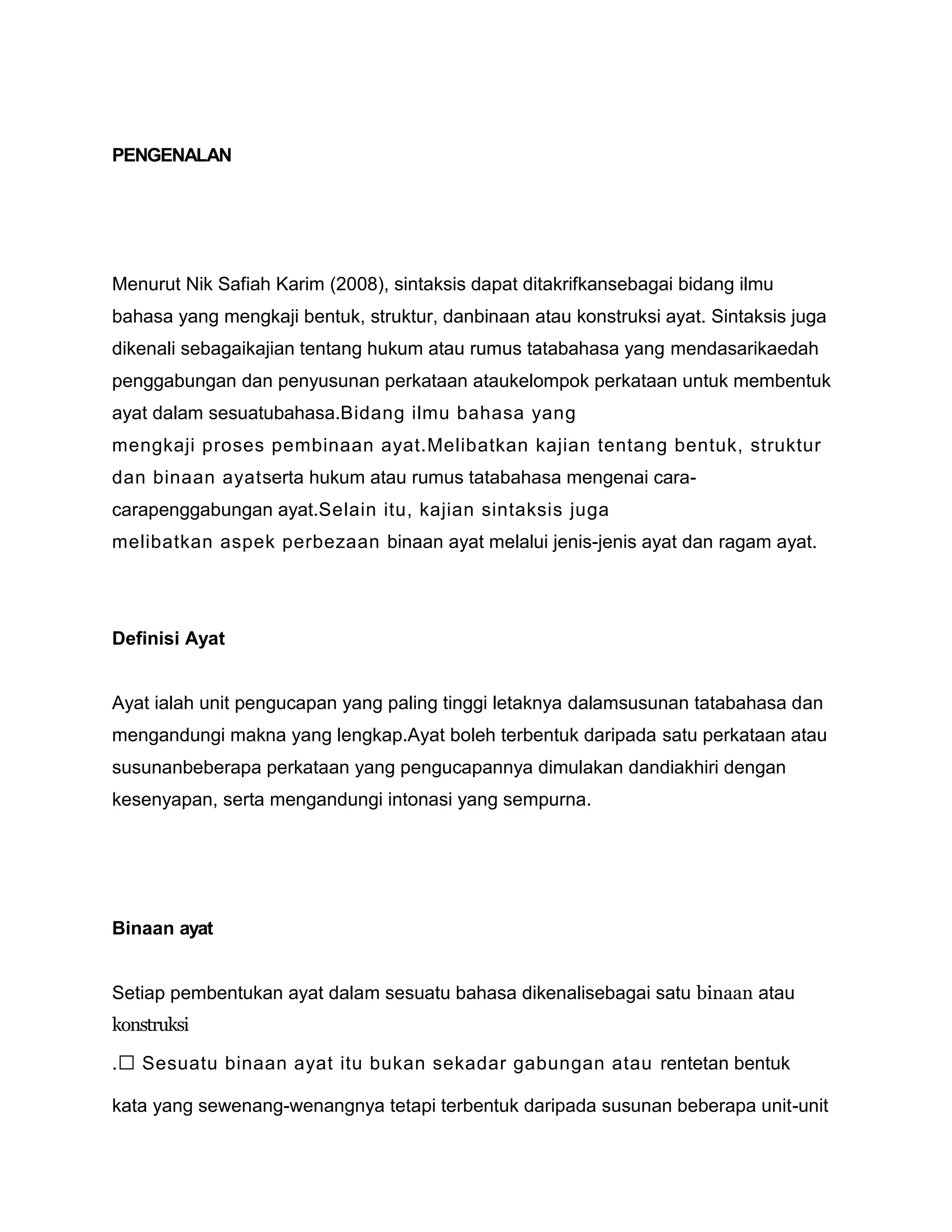 Sintaksis adalah bidang ilmu bahasa yang mengkaji bentuk, struktur, dan binaan ayat serta hukum tatabahasa dalam pembinaannya. Ayat merupakan unit pengucapan tertinggi yang mengandungi makna lengkap dan terdiri daripada subjek dan predikat. Binaan ayat tidak sekadar gabungan kata, tetapi satu konstruksi yang melibatkan unsur atau konstituen dalam bahasa.