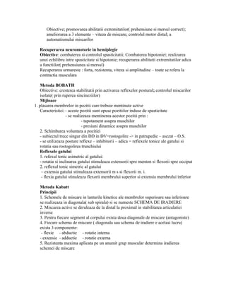 Documentul discută despre caracteristicile și stadiile diferitelor tipuri de paralizie, inclusiv hemiplegia și paraplegia, evidențiind simptomele și reflexele asociate. Se detaliază metodele de recuperare neuromotorie, precum Bobath și Kabat, și se subliniază importanța antrenării musculaturii și recuperării funcțiilor vitale. Obiectivele recuperării includ îmbunătățirea controlului motor, a mobilității și a abilităților funcționale ale pacienților.