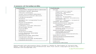This document discusses sinus node dysfunction (SND), which refers to dysfunction of the sinoatrial node that can cause various electrocardiogram abnormalities like sinus bradycardia, sinus pauses, and inadequate heart rate response to activity. Common causes of SND include sinus node fibrosis, medications that depress sinus node function, infiltrative diseases, inflammatory diseases, and sinus node artery disease. The document recommends permanent pacing for patients with SND who experience symptomatic bradycardia or pauses, as well as those with chronotropic incompetence. It describes various ECG patterns that can occur in SND such as sinus bradycardia, sinus pause/arrest, sinus node exit block, and chronotropic incompetence.