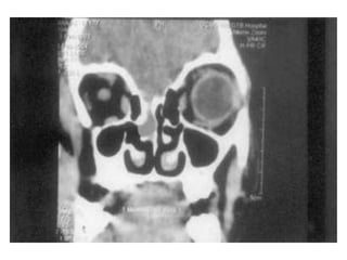 This document discusses sinus imaging using CT scans. It first describes the different sinus cavities in the anatomy: frontal, maxillary, nasal, ethmoid and sphenoid. Second, it lists common sinus pathologies seen on CT such as sinusitis, fungal sinusitis, deviated septum, sinus polyps, mucoceles, concha bullosa and sinus cancer. Finally, it presents two case studies and asks questions to test understanding of sinus conditions and anatomy.