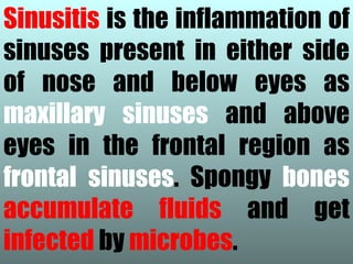 Sinusitis is an inflammation of the sinuses caused by infections and environmental factors, leading to symptoms like headaches and loss of taste. While medications provide limited relief, lifestyle changes such as performing pranayama, consuming warm herbal teas, and avoiding certain foods can significantly improve symptoms. Ayurveda offers treatments like sirovasti and nasya karma for long-term benefits, while conventional medicine primarily offers temporary relief with potential side effects.