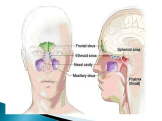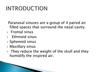 The document discusses paranasal sinuses and sinusitis. It defines paranasal sinuses as four paired air-filled spaces surrounding the nasal cavity. Sinusitis is an inflammation of the mucous membrane in the sinuses. Sinusitis can be classified based on location of the affected sinus or duration of symptoms. Acute sinusitis lasts less than 4 weeks while chronic sinusitis persists for over 12 weeks. Common causes include viral and bacterial infections, allergies, and structural issues impairing drainage. Symptoms vary depending on the affected sinus. Diagnosis involves medical history, exam, and imaging tests. Treatment focuses on relieving symptoms for acute cases but may involve antibiotics for persistent infections.