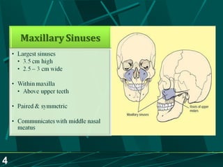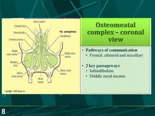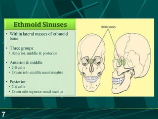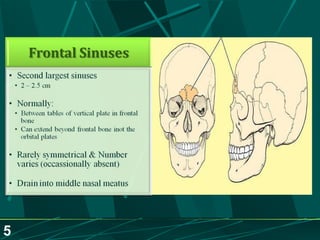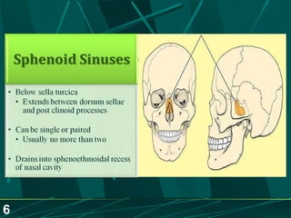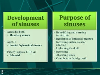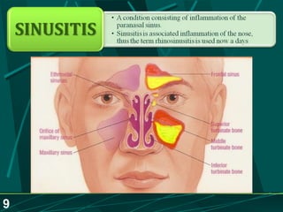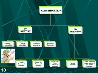 There are several types of sinusitis classified based on duration of episodes and symptoms between episodes. Acute bacterial sinusitis lasts less than 30 days with complete resolution of symptoms between. Sub-acute lasts 30-90 days with complete resolution, while recurrent acute is episodes under 30 days recurring every 10 days. Chronic sinusitis lasts over 90 days with persistent residual respiratory symptoms between episodes.