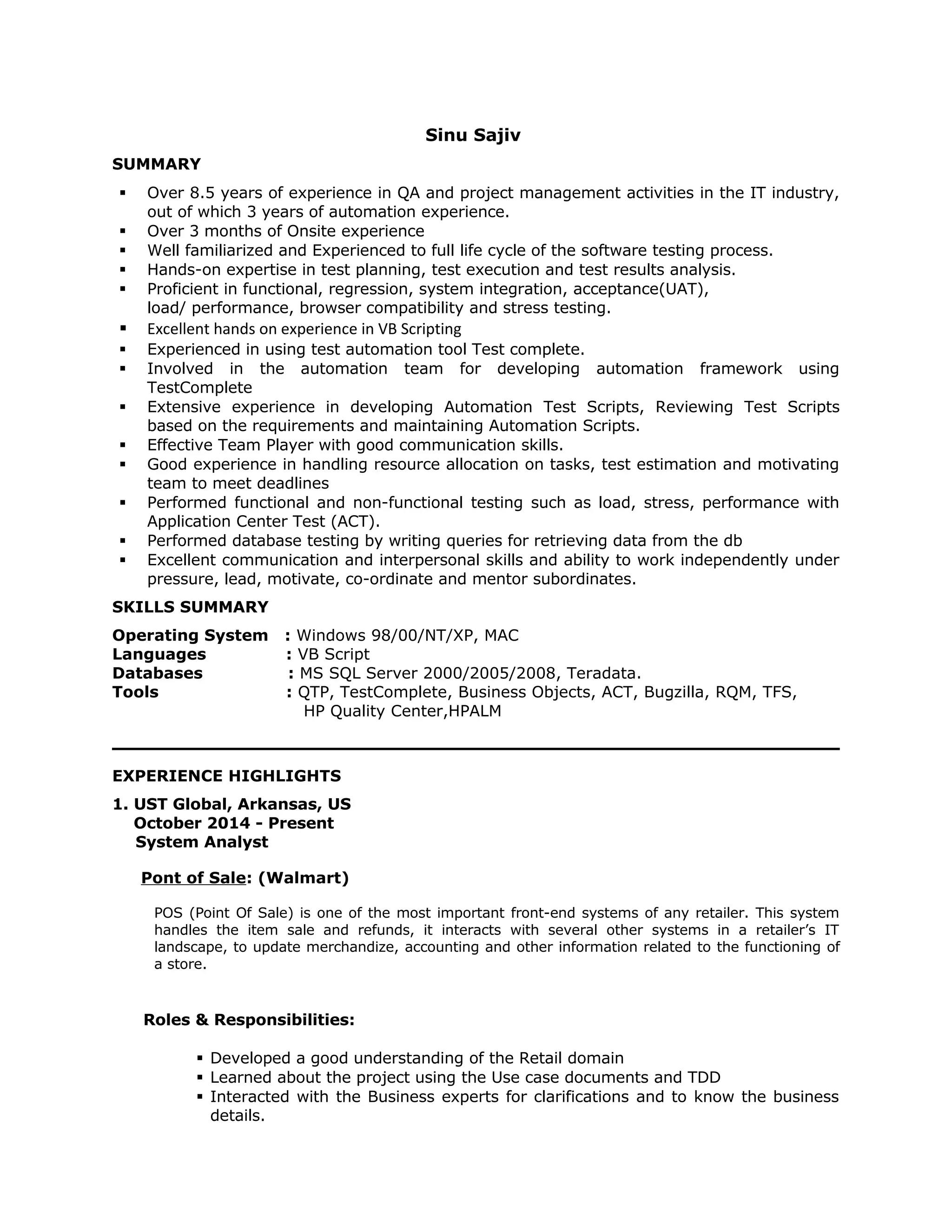 - The document contains the resume of Sinu Sajiv, who has over 8.5 years of experience in QA and project management roles in the IT industry, including 3 years of automation experience. Some of the key projects they have worked on include Point of Sale systems for Walmart, healthcare systems for IBC and Wellpoint, and image search/metadata projects for Alamy Images.