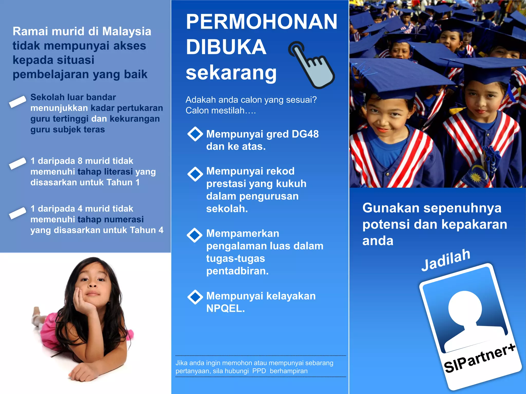 Dokumen ini mengumumkan pembukaan permohonan untuk calon-calon yang sesuai menjadi sipartner+ dan sisc+, yang bertujuan meningkatkan kualiti pengurusan dan pengajaran di sekolah. Calon yang diinginkan perlu mempunyai pengalaman mengajar, kelayakan akademik yang sesuai, serta kemahiran komunikasi yang baik. Program ini menawarkan peluang bimbingan yang intensif dan pertumbuhan profesional melalui kerjasama dengan pengetua, guru, dan pegawai PPD.