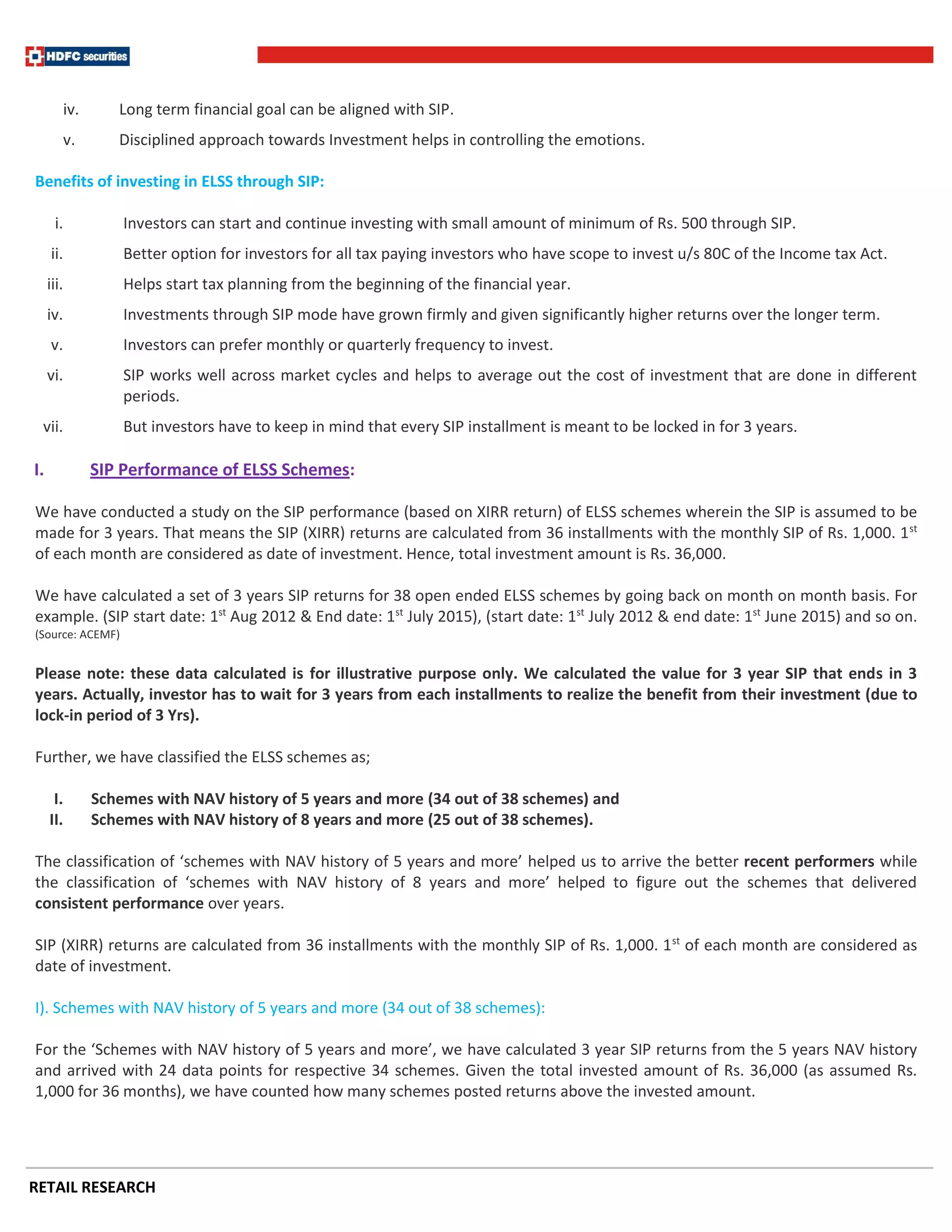 This document summarizes investing through systematic investment plans (SIP) in tax saving mutual funds, specifically equity linked saving schemes (ELSS). It discusses the benefits of SIP for long term wealth accumulation and tax savings. It analyzes the performance of 38 ELSS schemes over 3, 4, and 5 year periods based on monthly SIP investments of Rs. 1,000. Several schemes consistently outperformed benchmarks like Nifty and provided returns higher than the total investment amount. While lump sum returns are higher during market rises, SIP performs better during downturns and over the long run.