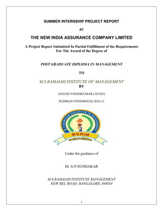 The document is a project report submitted by Anand Vinodkumar for his summer internship at New India Assurance Company Limited, fulfilling the requirements for a postgraduate diploma in management. It covers the evolution and competition within the Indian general insurance industry, detailing a 22% growth in premium income and highlighting the challenges of profitability amidst intense competition. The report combines industry analysis, company insights, and recommendations for improving profitability based on an internship experience and research findings.