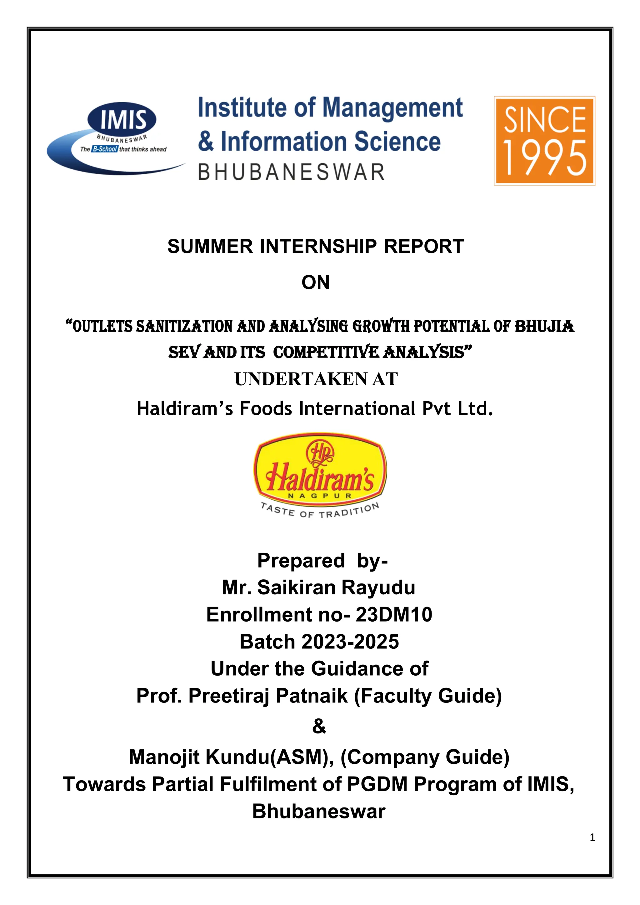 This summer internship report by Saikiran Rayudu analyzes the sanitization of outlets and the growth potential of Haldiram's bhujia sev, examining its competitive landscape and market strategies. The study highlights Haldiram's evolution since its founding in 1937, its international expansion, diverse product portfolio, and the importance of consumer preferences and market insights for driving growth. A detailed SWOT analysis reveals Haldiram's strengths and areas for improvement, offering practical recommendations for enhancing market presence and operations.