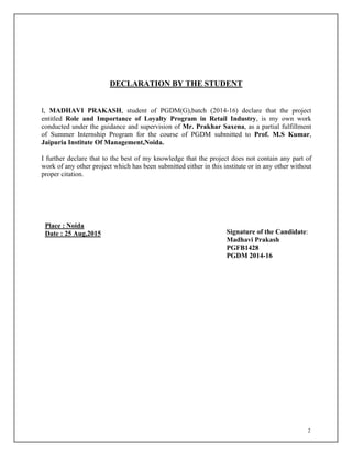 This document provides an overview of loyalty programs in the retail industry. It discusses how loyalty programs can increase customer knowledge, improve customer retention rates, and help attract, retain and grow customers. Specifically, the document notes that Pantaloons uses a loyalty card program called the "Green Card" to reward repeat customers with discounts and build customer loyalty. Research was conducted surveying 50 Pantaloons customers, most of whom had been using the Green Card for over 2 years. The results found 84% of these long-term customers were satisfied with the loyalty program.