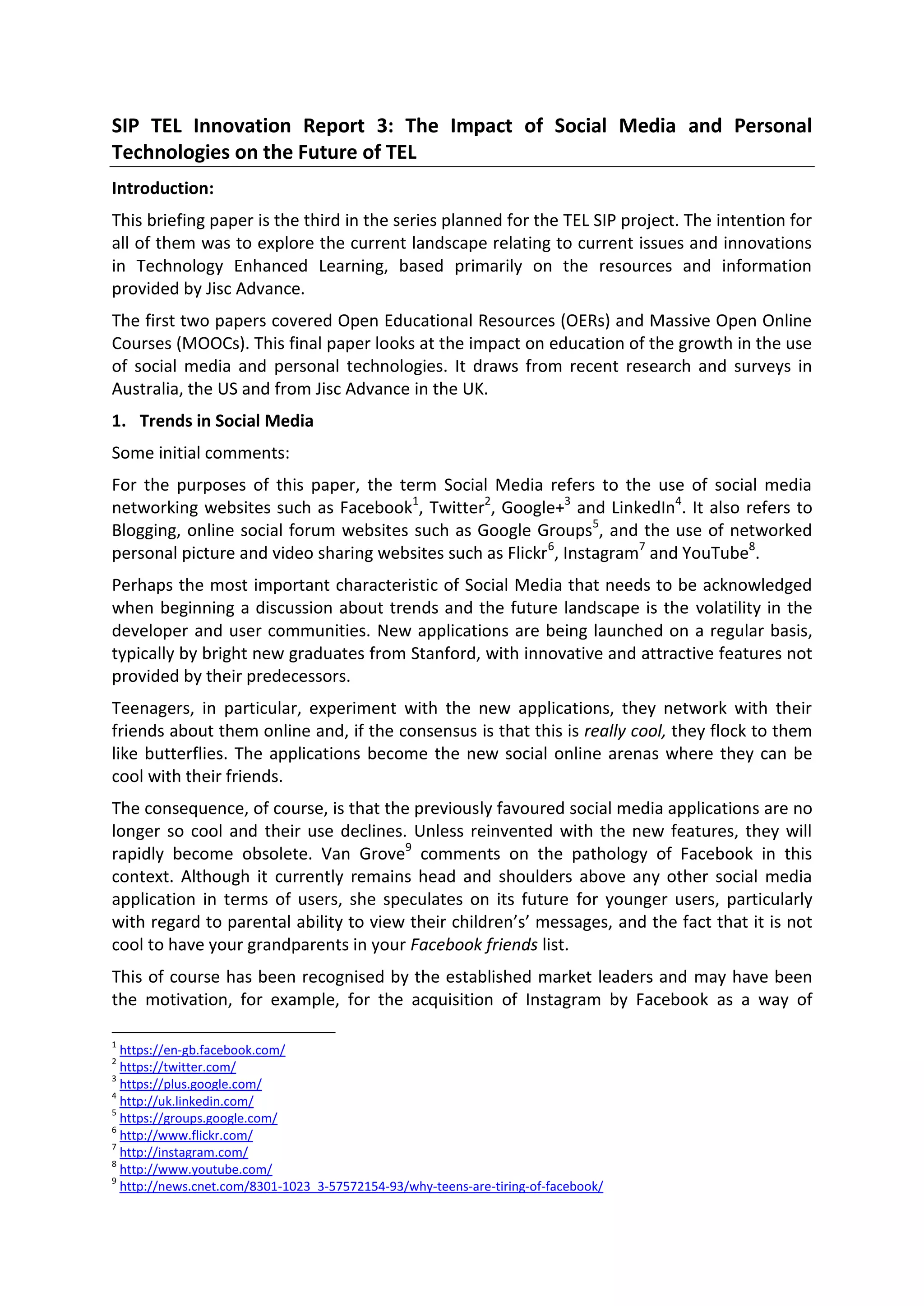 This document discusses trends in social media, personal technologies, and their impact on technology enhanced learning (TEL). It finds that social media usage is growing rapidly, led by Facebook, LinkedIn, Instagram and Twitter. Younger users experiment frequently with new apps and platforms. Mobile access to social media is also rising quickly, led by smartphones, tablets, and personal cloud services. Within education, academics are increasingly using social media like YouTube, blogs and wikis to support teaching. Looking ahead, the document predicts that social media and personal technologies will profoundly transform educational delivery, with learning environments constructed online using freely available tools.