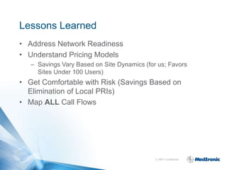 This document discusses lessons learned from Medtronic's SIP trunking implementation with Verizon. Key points include: