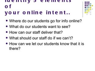 The document provides suggestions for improving a school's online presence and engagement with students. It recommends identifying where students go online for information, what content they want to see, and how staff can deliver that content. The document outlines using existing platforms like Facebook and blogs, having a posting schedule, involving all staff, and using analytics to measure effectiveness. It also advises what to do if staff cannot deliver content and how to promote the school's online resources to students.