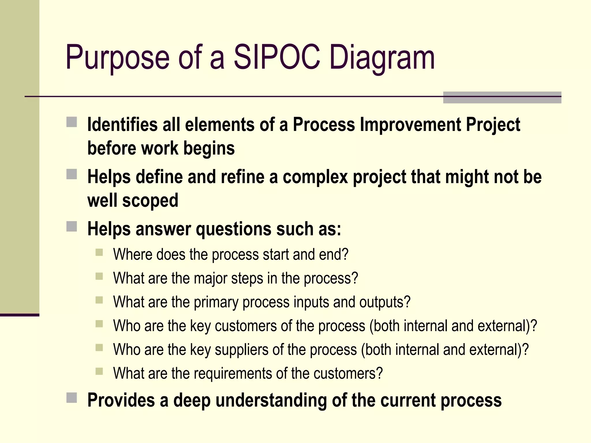 A SIPOC diagram identifies all elements of a process improvement project before work begins. It helps define the scope of a complex project by answering questions about where the process starts and ends, its major steps, inputs and outputs, key customers and suppliers, and customer requirements. The diagram provides a deep understanding of the current process. It typically includes suppliers, inputs, process steps, outputs, and customers. Metrics may also be included to define quality, time, and cost of inputs, processes, and outputs. The diagram helps scope and plan a process improvement project.