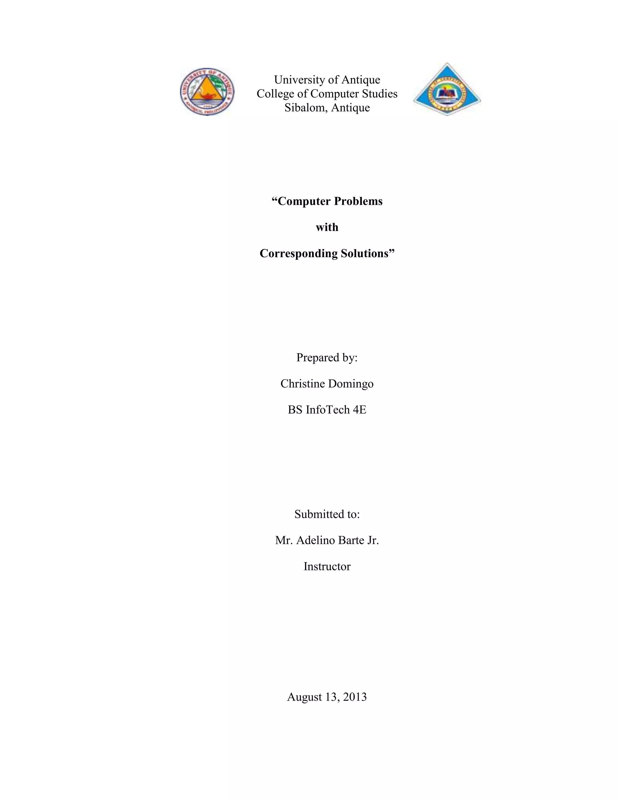 The document provides solutions to 20 common computer problems. For each problem, it lists the steps to troubleshoot and resolve the issue. The problems covered include slow computer speed, system shutting down after short time, printer issues, audio and video playback errors, unresponsive keyboard and mouse, and more. Troubleshooting steps involve checking connections, updating drivers and software, cleaning hardware, and restarting the computer and individual programs.