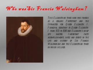 Sir Francis Walsingham was a principal secretary and spymaster for Queen Elizabeth I from 1573 to 1590. He was born in 1532 and studied at King's College in Cambridge before fleeing England during the reign of Catholic Queen Mary I. Walsingham established contacts with Protestants on the continent and in England cultivated a friendship with Sir William Cecil that led to him becoming a member of Parliament in 1559. Elizabeth I tasked Walsingham with aiding French Huguenots in negotiations in 1570 due to his relationship with them, and he was made her principal secretary in 1573 in recognition of his service.