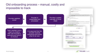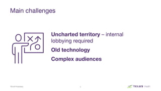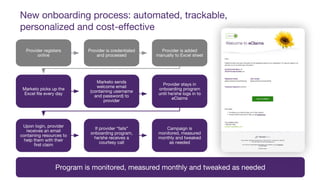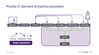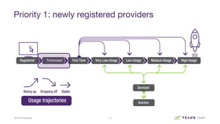Providers who had not submitted claims in 30 days were identified as dormant. Thresholds for dormancy were defined and a BI tool was integrated to track usage quartiles and claim submission. A multi-channel outreach campaign including emails, landing pages, and calls was launched to re-engage dormant providers based on their reason for dormancy. The results of the campaign exceeded original objectives by 7 times and helped enable providers to improve patient experience, streamline insurer administration, and improve healthcare delivery in Canada, while also providing a key revenue-generating strategy for TELUS Health in line with their mission.